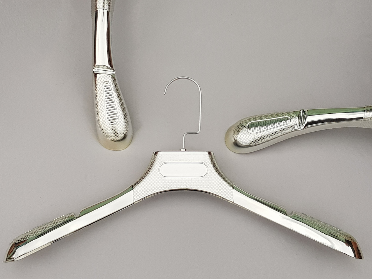 Плічка вішалки тремпеля сріблястого кольору з антиковзаючим ребристим плечем, довжина 44 см